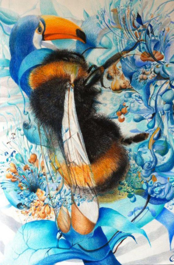 „Es könnte auch ein Suchbild sein: Das urwaldähnlich Universum besteht aus bizarren Pflanzen, Tieren und Menschenwesen, die kunstvoll miteinander verwoben sind. Manche dieser Wesen entdeckt man erst, wenn man genau hinschaut. Eglé Pakarklyte ist eine wahre Meisterin der fantastischen Buntstiftmalerei. Mit feinen Strichen schafft sie eine eigene plastische Welt.“